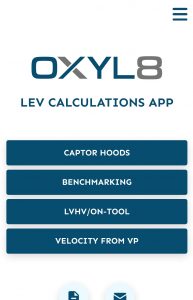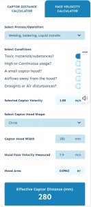 The App can be used by LEV Specialists to calculate the required Hood Entry (Face) Velocity for a given hood style/size and also to calculate the Effective Captor Distance for a hood if the hood details such as size, shape and Face Velocity are known.